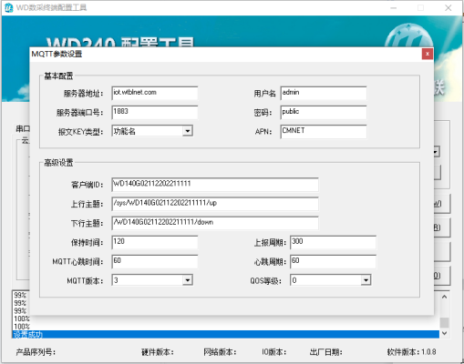 设置好基本参数后,点击“MQTT配置”,配置MQTT服务器的IP地址,端口以及上下行主题(Topic)等参数,如下图: