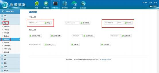 进入网关WEB界面,在“网络”- >“网络诊断”界面中,顺利获得Ping和Telnet可测试网关是否和松下PLC正常连接。
