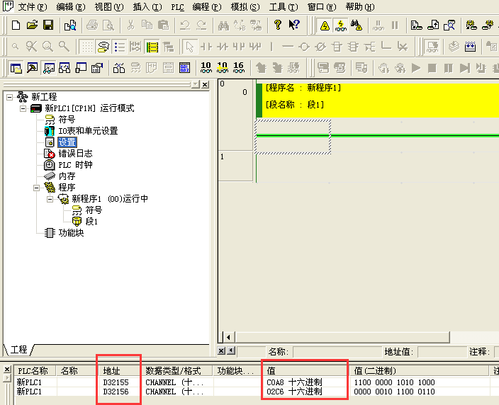 启动CX-P,打开菜单栏中的PLC---自动在线---USB连接,连接成功后,打开菜单栏中的视图---窗口---查看,输入地址:D32155、D32156,将查询得出的十六进制的值换算成十进制的值,就是CP1W-CIF41选件板的IP地址(C0A802C6=192.168.2.198)。