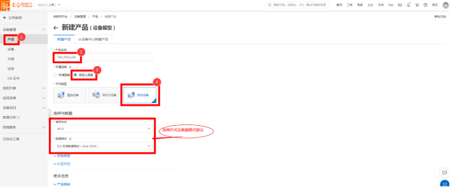 所属品类根据实际场景选择,节点类型选“直连设备”,连网方式,数据格式默认。详见图2