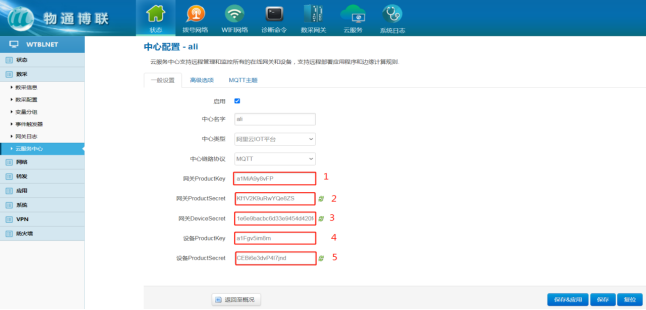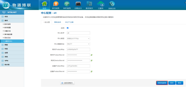以上填写完成后网关界面点击“保存”,可回阿里云确认网关是否激活在线