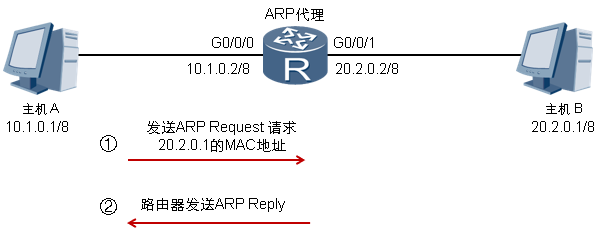 4:网关收到数据包后的处理:网关收到这样的请求,会查找路由表,如果存在主机B的路由表项,路由器将会使用自己的G0/0/0接口的MAC地址来回应该ARP request。主机A收到ARP reply后,将以路由器的G0/0/0接口MAC地址作为目的MAC地址进行数据转发。