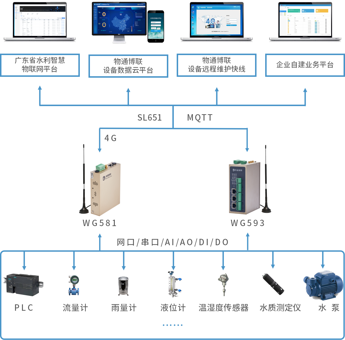 顺利获得k豆kdpay钱包AI工业智能网关采集PLC、流量计、温湿度传感器、雨量计、液位计等等相关设备数据,将流量、流速、水位、水深、温度、湿度、水压等等数据顺利获得边缘计算、数据标准化后以4G/WIFI等网络方式顺利获得MQTT/SL651等协议传输到广东省水利智慧物联网平台或者企业自建业务平台。