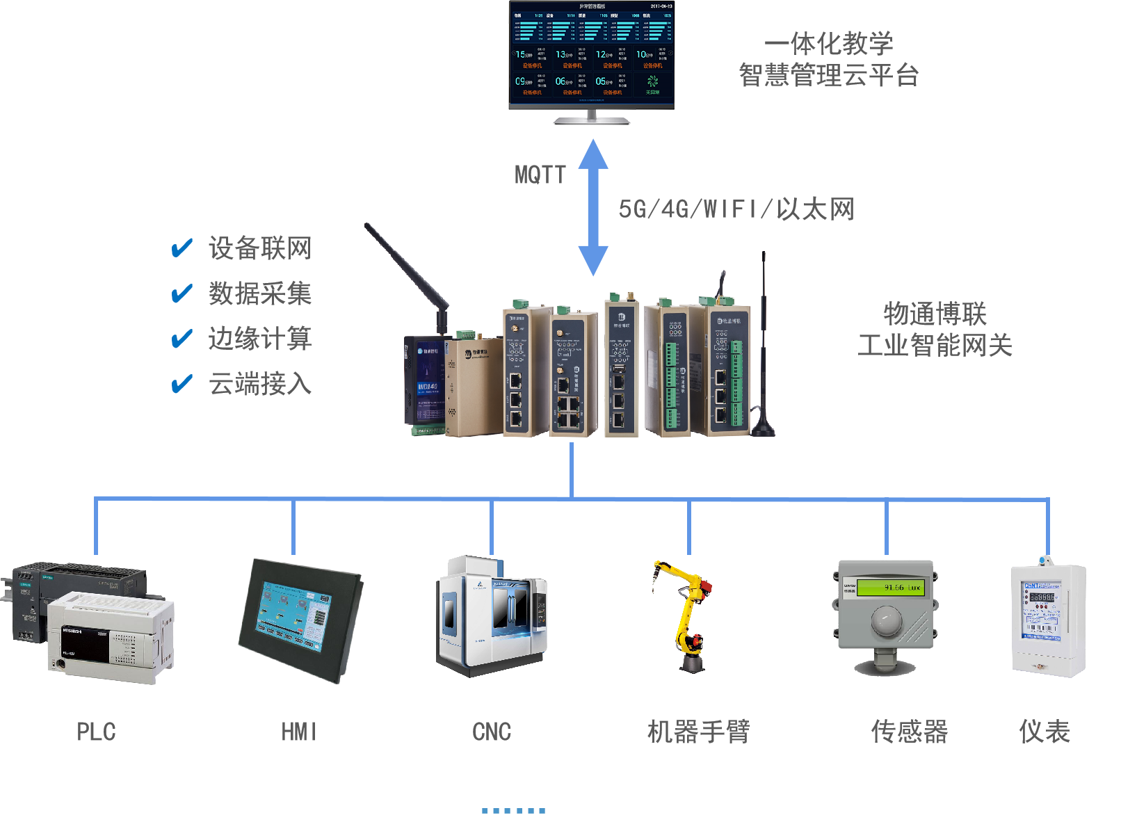 k豆kdpay钱包AIWG系列工业智能网关是一款两化融合和边缘计算网关,具有丰富的物理接口,如RS232、RS485、以太网口、IO接口等,与实训平台的各种工业设备连接,解决接口不统一问题,内嵌丰富的工控协议和智能采集算法,实时采集设备数据,网关支持各种边缘计算功能如智能采集、数据过滤、报警计算、跳变触发、公式计算、分组策略、定时任务、算法开发等,顺利获得对设备的模型建立和数据标准化后,将数据顺利获得MQTT协议上传到一体化教学智慧管理云平台,帮助平台实现各类工业设备数据的无缝接入、高效整合与精准应用,为提升实训效果给予了强有力的技术支撑。