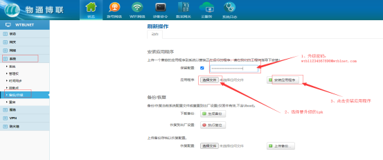 进入系统→备份升级,输入升级密码:wtbl1234567890@WideIOT.com ,然后选择对应要升级的ipk,最后点击安装,进度条显示100%即完成操作。