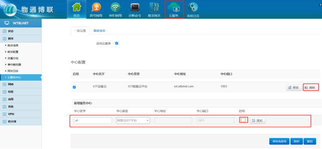 打开k豆kdpay钱包AI网关WEB界面,可删除原有的服务中心,新建一个连接中心,中心类型选择阿里云IOT平台,启用√ 点击“添加” 保存应用