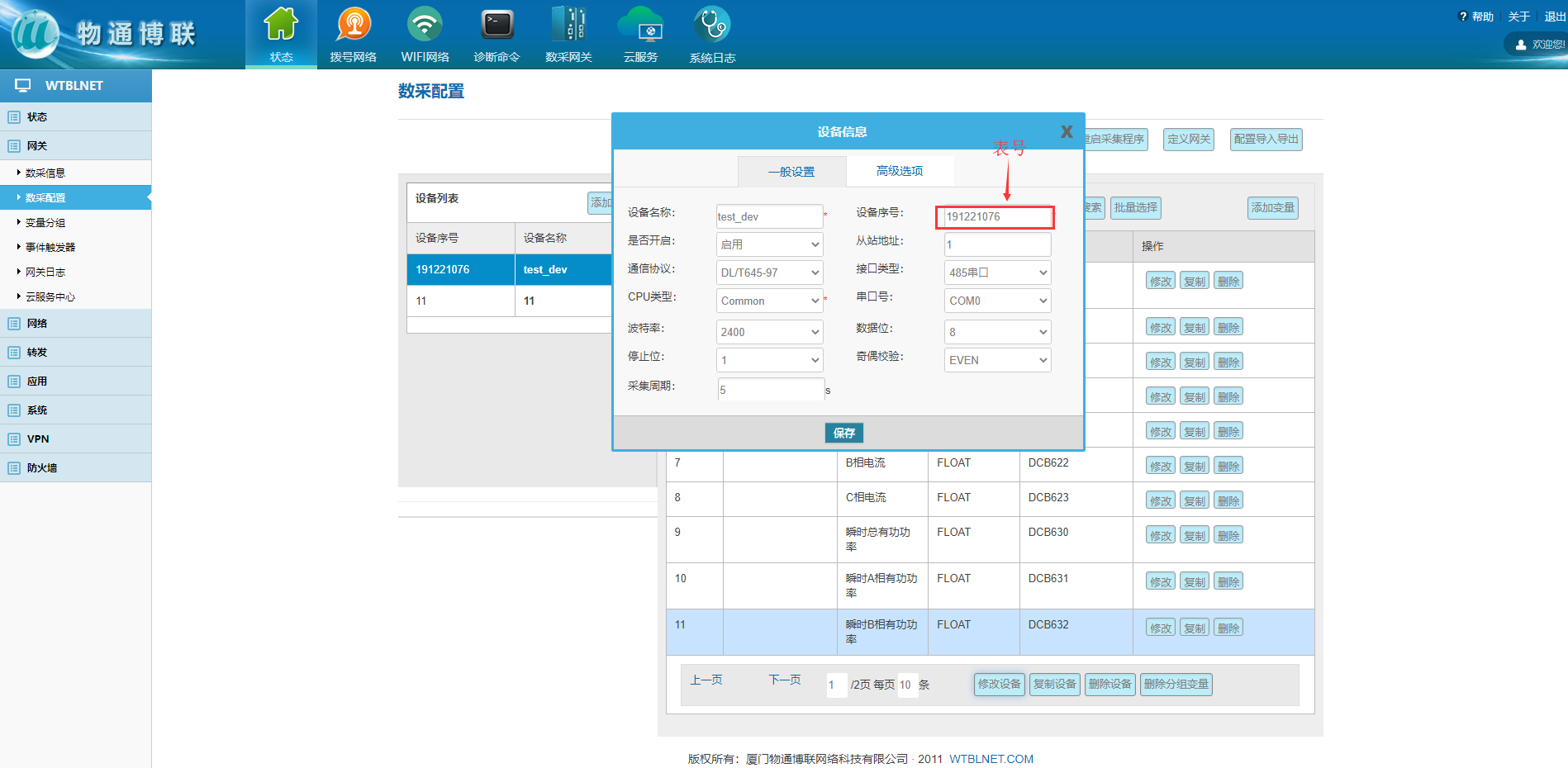 高级配置内的设备扩展字段默认为0,如需调节静止时间(单位ms),输入0;0;0;XXX 2. 数采配置-变量配置