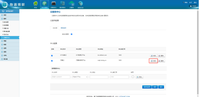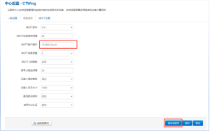 中心名字:自定义 中心类型:天翼物联网平台 中心地址:mqtt.ctwing.cn 中心端口号:1883 添加完成后,点击修改,进一步填写连接参数等信息。