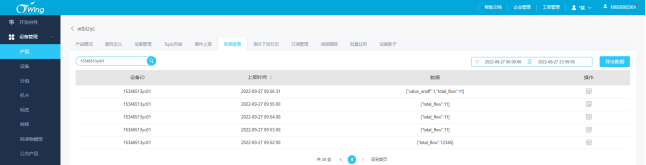 3 天翼物联网平台远程写入 (一)查看网关上报数据 在产品——设备管理页面点击数据查看,即可查看网关上报的数据。