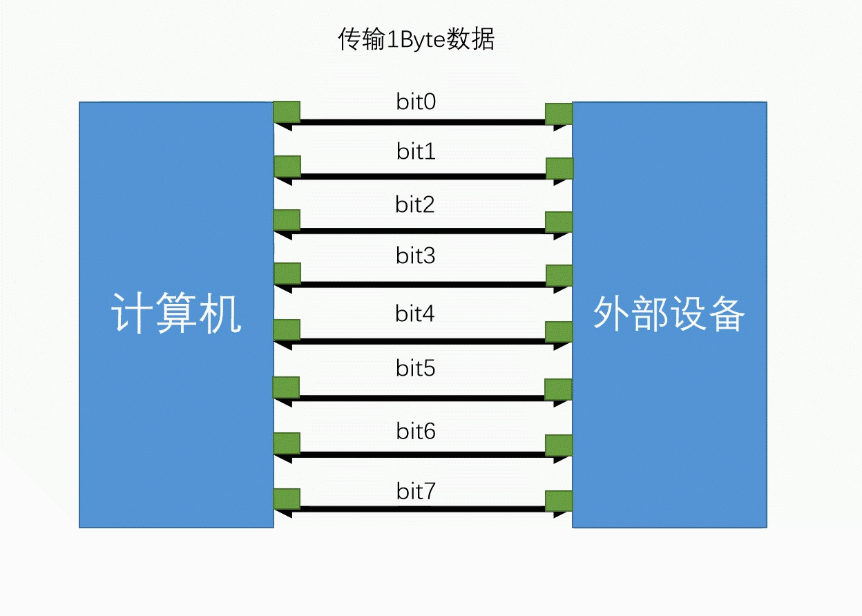 如果一组数据的各个数据(位)在多条线上同时传输,则这种传输方式称为并行通信。举例一个字节的8个位置,在8条电线上同时传输!最简单的理解就是PLC的IO接线,一根线对应一个信号!