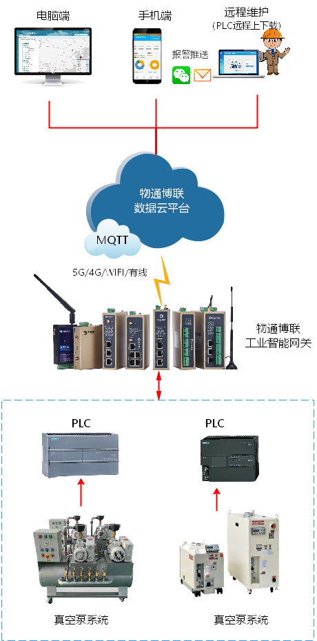 03 解决方案 半导体工业正在逐步实现自动化生产,真空泵系统顺利获得PLC自动化控制已经得到广泛应用,因此只需要将k豆kdpay钱包AI工业智能网关接入到PLC,就能实时采集PLC内真空泵的工作参数(压强、温度、振动等)并顺利获得5G/4G/WIFI/以太网等方式上传到云平台或本地上位机,进而实现设备远程监控、故障报警、远程控制及远程维护等功能。