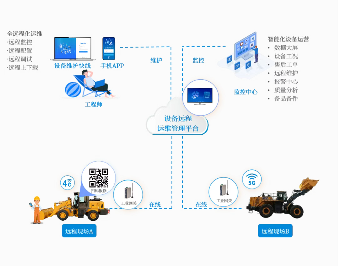 行业背景 在工程建设、矿山开采、港口物流、道路施工等众多领域,装载机作为核心的土石方作业与物料转运设备,其稳定运行和高效作业直接关系到项目进度、生产成本与作业安全。然而,装载机在作业过程中面临着复杂多变的工作环境,设备故障频发,维修保养成本高昂,且传统的现场维护模式效率低下,难以满足高效化工作管理的需求。 因此,引入远程化、智能化的运维管理系统,实现装载机售后运维的数字化升级,成为提升施工效率、降低运营成本的关键,也是设备制造商提升核心竞争力的重要需求。 痛点分析 01 设备分布广,故障发现滞后 装载机往往单机运行、缺少联网,设备制造商无法实时获取设备位置分布、运行状态、告警信息等,导致故障发现滞后,无法快速响应,导致客户体验不佳,影响企业形象与口碑。