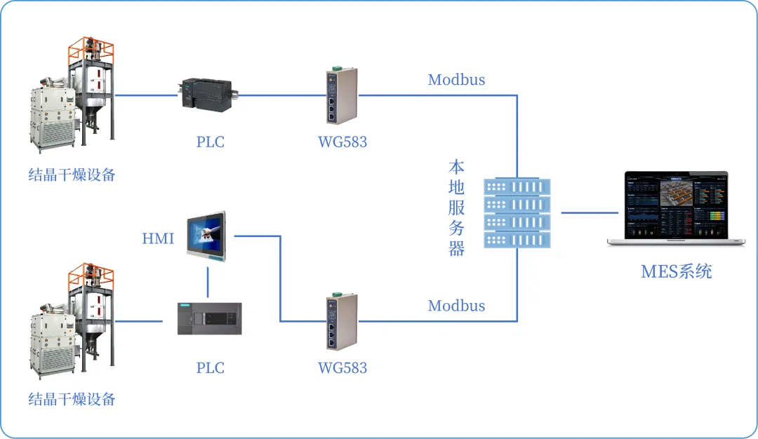 方案背景 客户企业从事再生塑料加工行业,现在已实现车间多台结晶干燥设备的自动化改造,主要顺利获得PLC控制柜获取结晶干燥设备的工艺数据(温度、湿度、风力等),从而来控制风机的工作频率,使设备温度始终处于高效益区间内。同时控制面板也升级为HMI触摸屏,方便操作与控制。 虽然企业已实现自动化生产作业,但在设备管理环节仍存在明显短板;一方面设备联网率低,缺乏远程监控与集中管理手段,十分依赖值班人员进行巡检和数据抄录工作,工作效率低且时效性不足;另一方面,不同品牌的PLC协议隔绝孤立,难以快速兼容进MES系统中,信息化水平低。 需求分析 01 现场包括西门子、汇川等品牌PLC,部分通信接口被占用。因此除了直连PLC进行数据采集外,也要顺利获得触摸屏HMI进行数据采集。 02 MES系统部署在本地服务器中,需要将PLC数据传输到MES系统中。因此需要实现以太网上网,并顺利获得Modbus协议与MES系统进行通信。 03 设备出现故障无法快速觉察,往往导致停机停产,十分影响生产排产与订单交付。因此,需要实现设备异常故障时的自动化告警,包括现场告警与远程告警。
